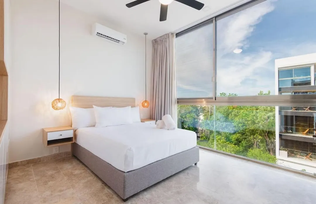 The 90 ft² Gaia 304 - Ph In Aldeazama Apartment Tulum is located 1.5 miles from Avenida Kukulkan and around a 25-minute walk from Playa Pescadores. Staying at this 2-bedroom apartment in the Zama district of Tulum, guests can use a fitness suite as well as a swimming pool.