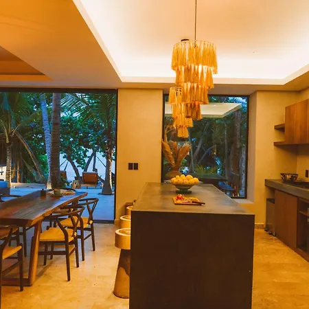 An equipped kitchen with a fridge and a kitchenware is featured at Elements Rituals Beachfront Bahia Soliman Tulum villa. The Tulum property is also 35 miles from Aeropuerto de Playa del Carmen airport.