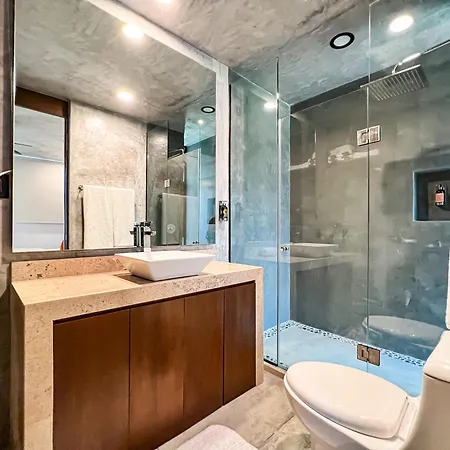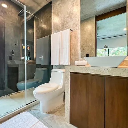 Bathroom facilities at 3Br Gated Villa Private Pool, Gym & Shared Pool Best Area Tulum also include a separate toilet and a shower. Bathrooms also feature a hair dryer, bath sheets, and towels for added comfort.