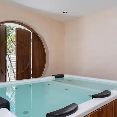 The villa includes an outdoor dining area with a microwave, an electric kettle, and a refrigerator. You can indulge in a private pool or rent cars and explore the beauty of Tulum.