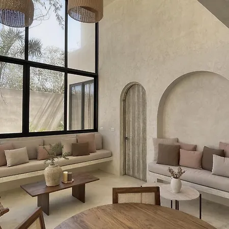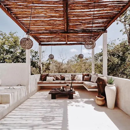 Overlooking the garden, the Tulum villa welcomes its guests.