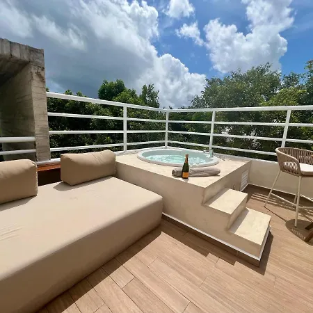 Tuluminati House-Bohemian Chic Luxury @Zama, Tulum Villa comes with a bathroom with a hot tub.